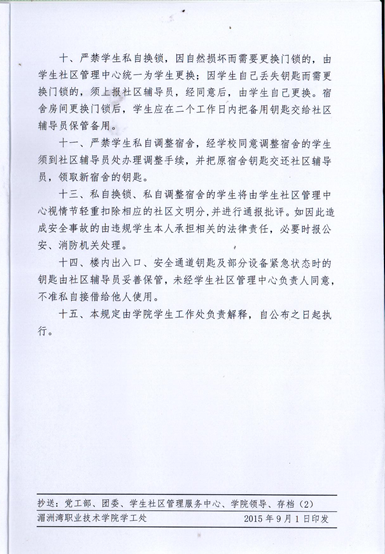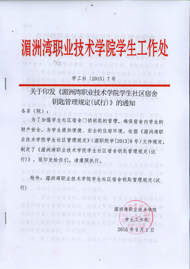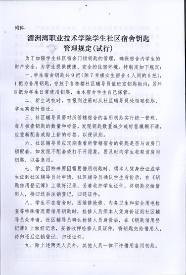 关于印发《湄洲湾职业技术学院学生社区宿舍钥匙管理规定(试行)》的通知
